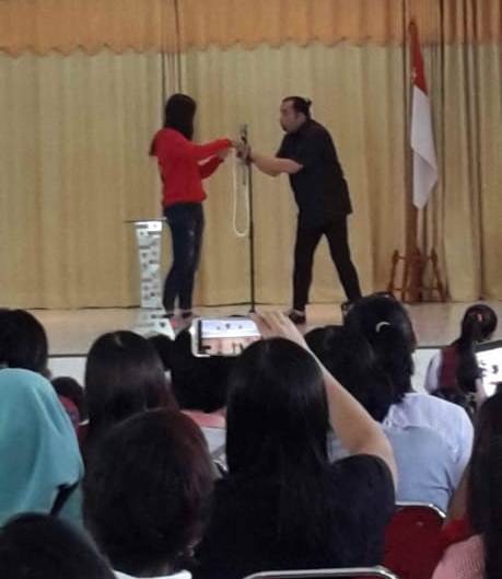 KanalBekasi.com – Aksi sulap Adri Manan dan Istrinya Meliana Pancarani alias Rani mampu memukau penontonnya yang sebagian besar orangtua dan siswa sekolah. Aktraksi unik yang dibawakan pesulap senior ini , sekaligus memberikan pemahanan tentang bahaya gadget atau gawai terhadap anak.