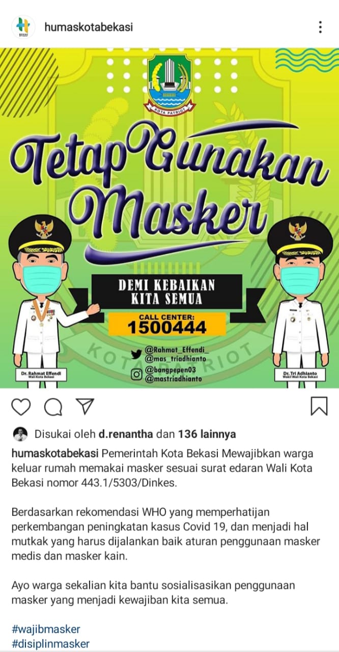 Semua konten yang disajikan Media Sosial Humas Pemerintah Kota Bekasi pun terus mengingatkan agar semua wajib menerapkan protokol kesehatan kapanpun dan dimana pun. Selain itu informasi mengenai kebijakan Pemerintah Kota Bekasi disajikan dalam bentuk rilis berita media penyebaran informasi publik. (hms)