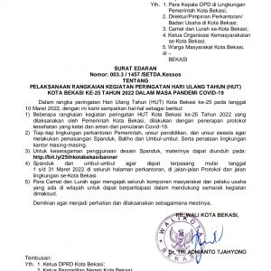 KanalBekasi.com – Dalam rangka peringatan Hari Ulang Tahun ke-25 Kota Bekasi pada tanggal 10 Maret 2022, Plt. Wali Kota Bekasi Tri Adhianto mengeluarkan Surat Edaran Nomor 003.3/1457/SETDA.Kessos tentang Pelaksanaan Rangkaian Kegiatan Peringatan Hari Ulang Tahun (HUT) Kota Bekasi ke-25 Tahun 2022 dalam Masa Pandemi Covid-19.